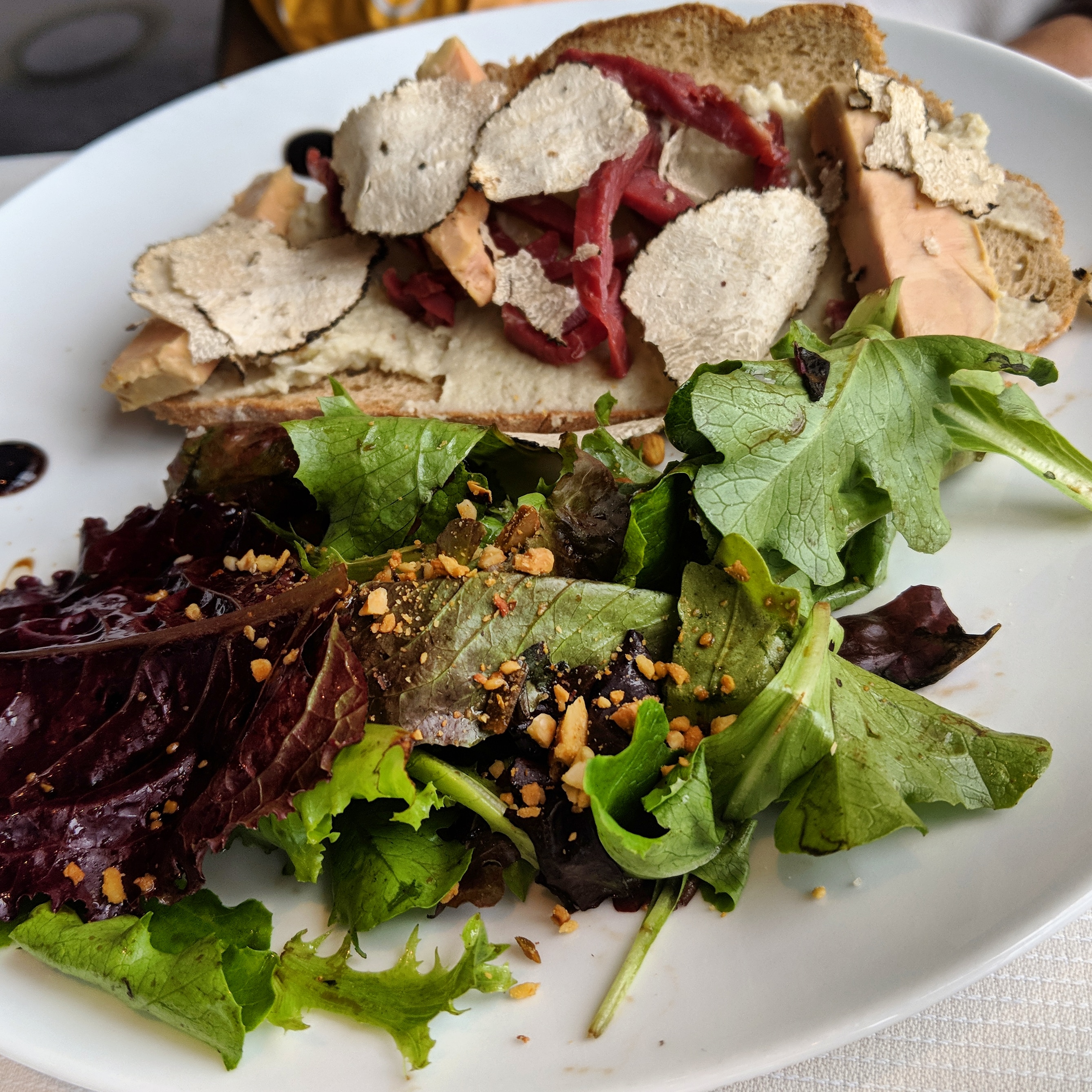 Starter – Artichoke cream & foie gras on a toast with summer truffle shaves and smoked duck breast fillet