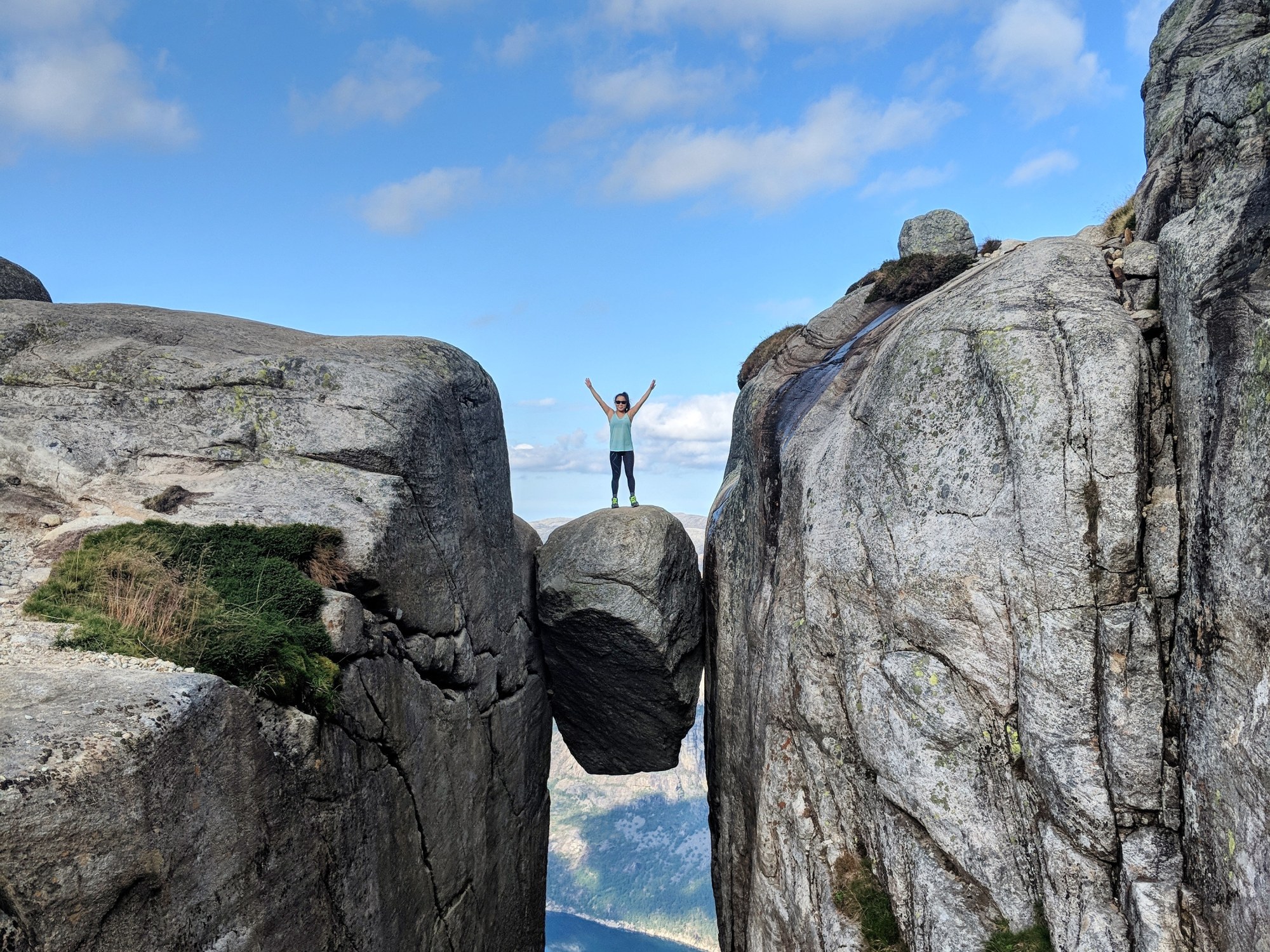 We relaxed here for an hour. Most people will stand on the boulder and get photos taken (which I did) and I would say it’s relatively safe as it’s quite wide. However, if you are generally nervous or not confident with heights, I advise you not to go on it. We also enjoyed the views whilst eating our lunch and of course, had kvikk lunsj. It started to get busier so as I always say, try to start the hike as early as possible!