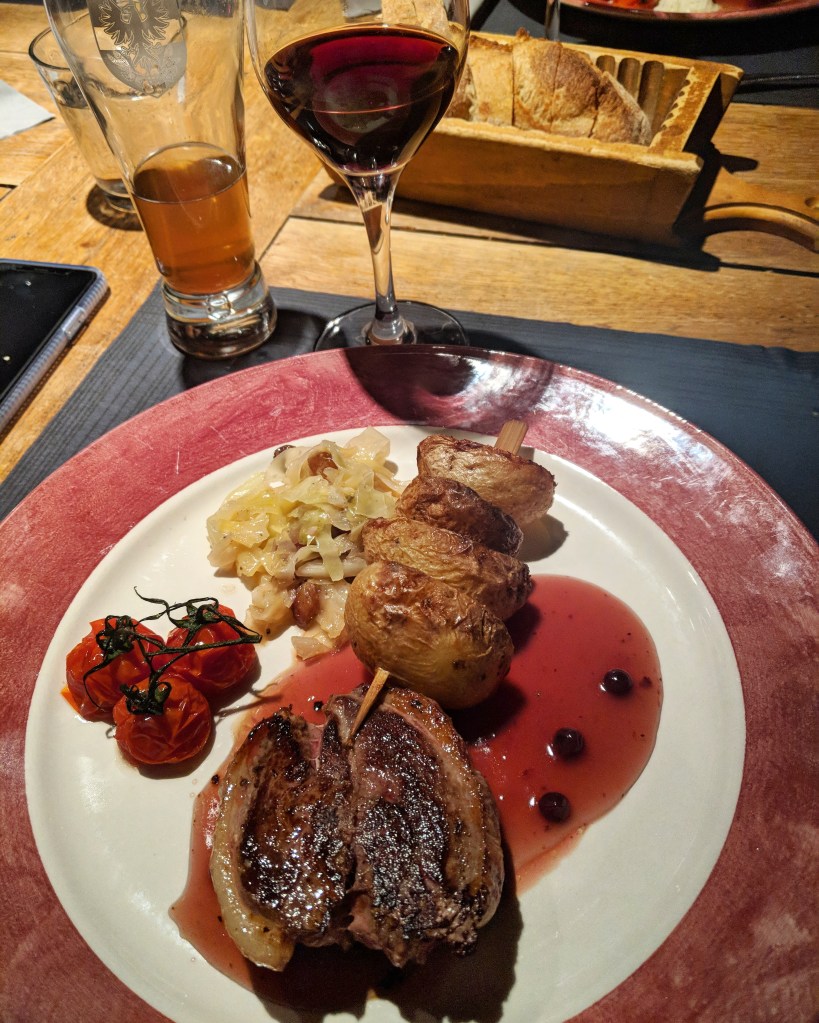 The next morning was tough especially as we were hungover! We did about 2 hours of skiing in the morning then had lunch at La Tete de Solaise which was excellent but highly recommend you make a reservation. I had the duck breast which was delicious and a huge portion! For dinner, we headed to nearby Le Barillon where we shared the baked camembert and I had the cote de boeuf.