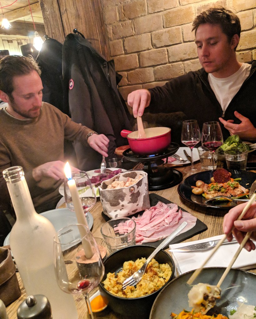 We checked in and then went to La Sana for burgers and headed to La Cave for some wine. We headed back to the hotel and organised our ski hire then went for dinner at La Vieille Maison. We shared the cheese fondue and the raclette (which was disappointing) and I had the duck which was nice.