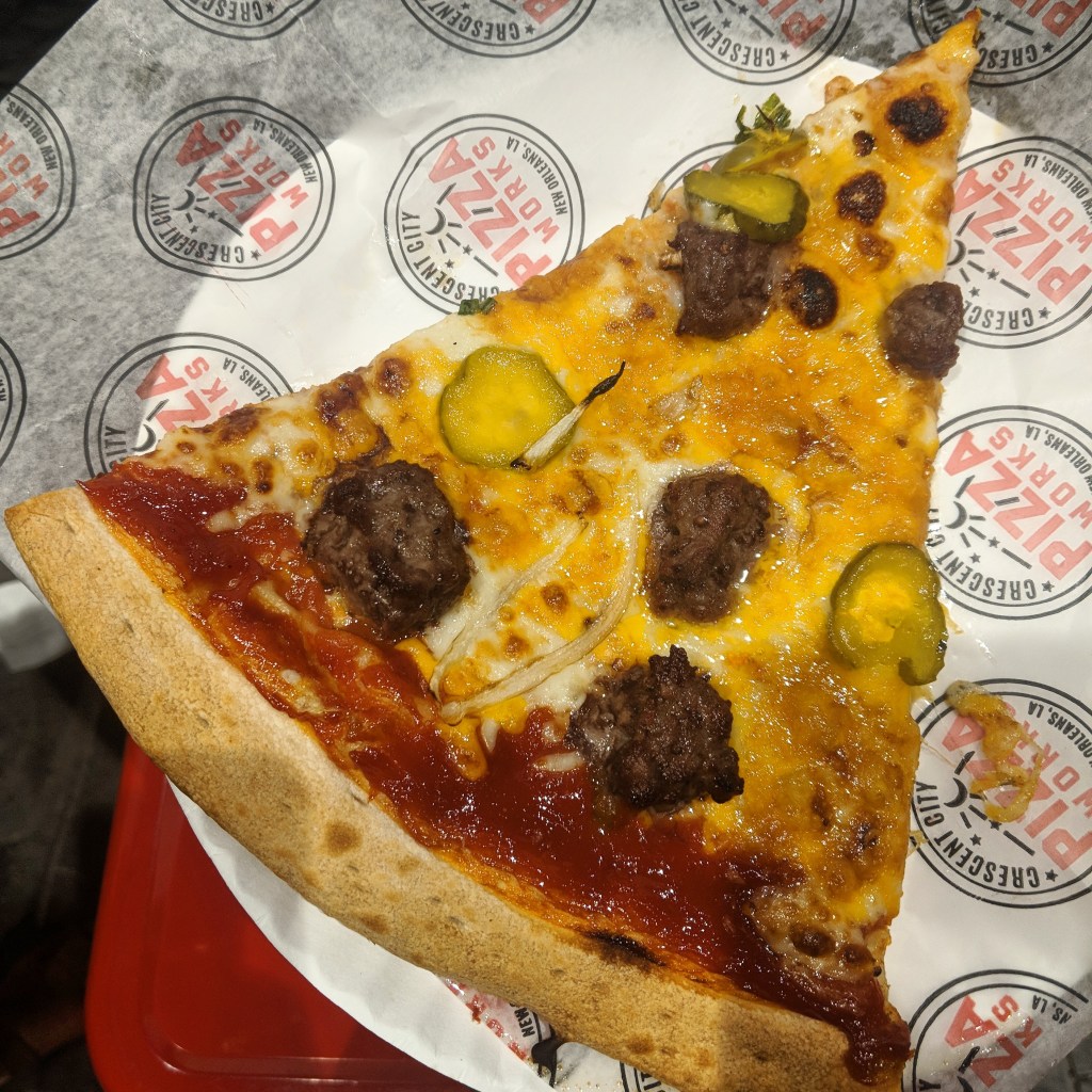 Afterwards, we headed to Frenchman Street for some live jazz and had a couple of drinks before walking back through Bourbon Street. Liz, Darcie and I stopped by Crescent City Pizza for a slice of pizza. I got the “chizzaburger” which was a cheeseburger flavour one which was on point!