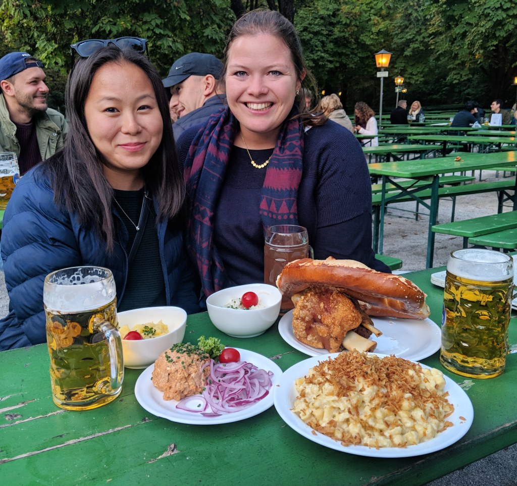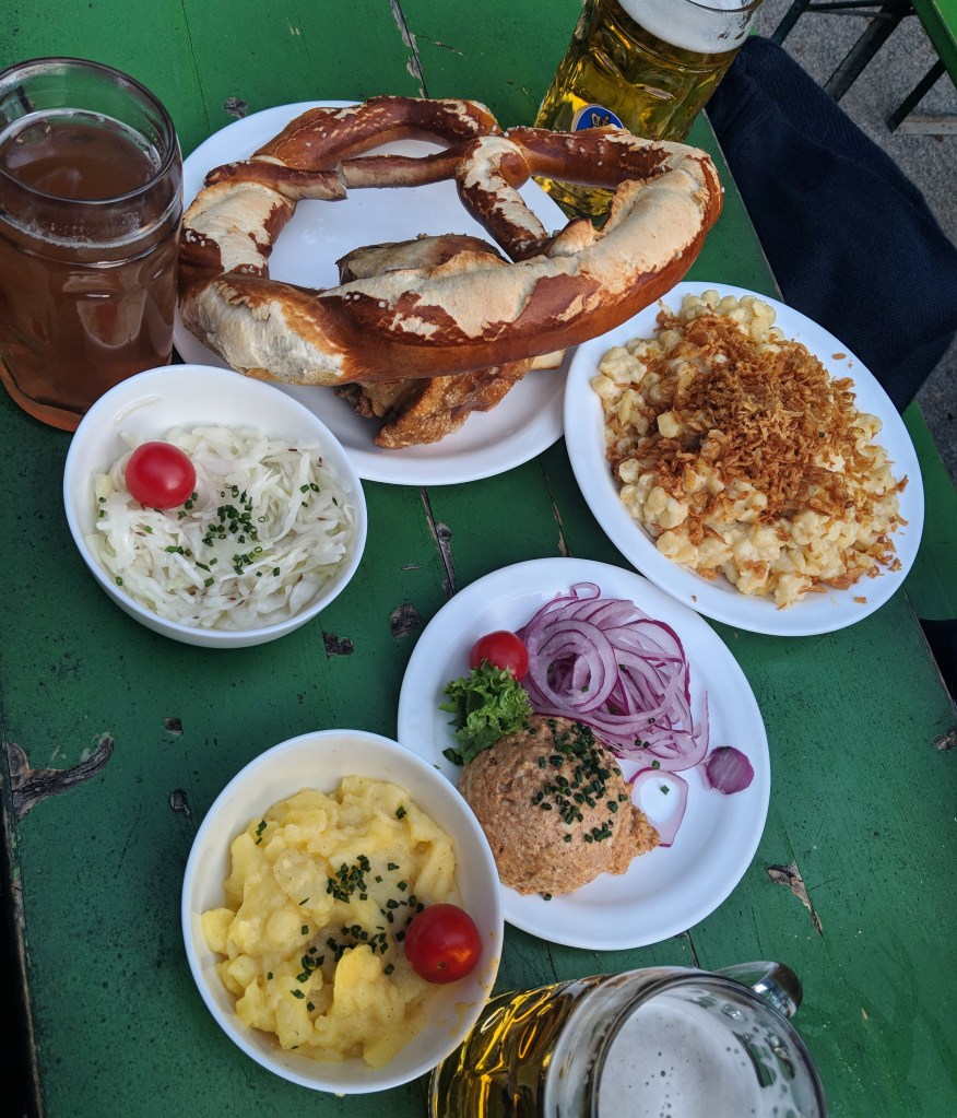 I arrived on Friday afternoon and we headed to beer garden at the Chinesischer Turm. We shared a lot of traditional German food including pretzel, pork knuckle, cabbage salad, a cheese dip, spatzle which were all delicious. We of course had some beer too!