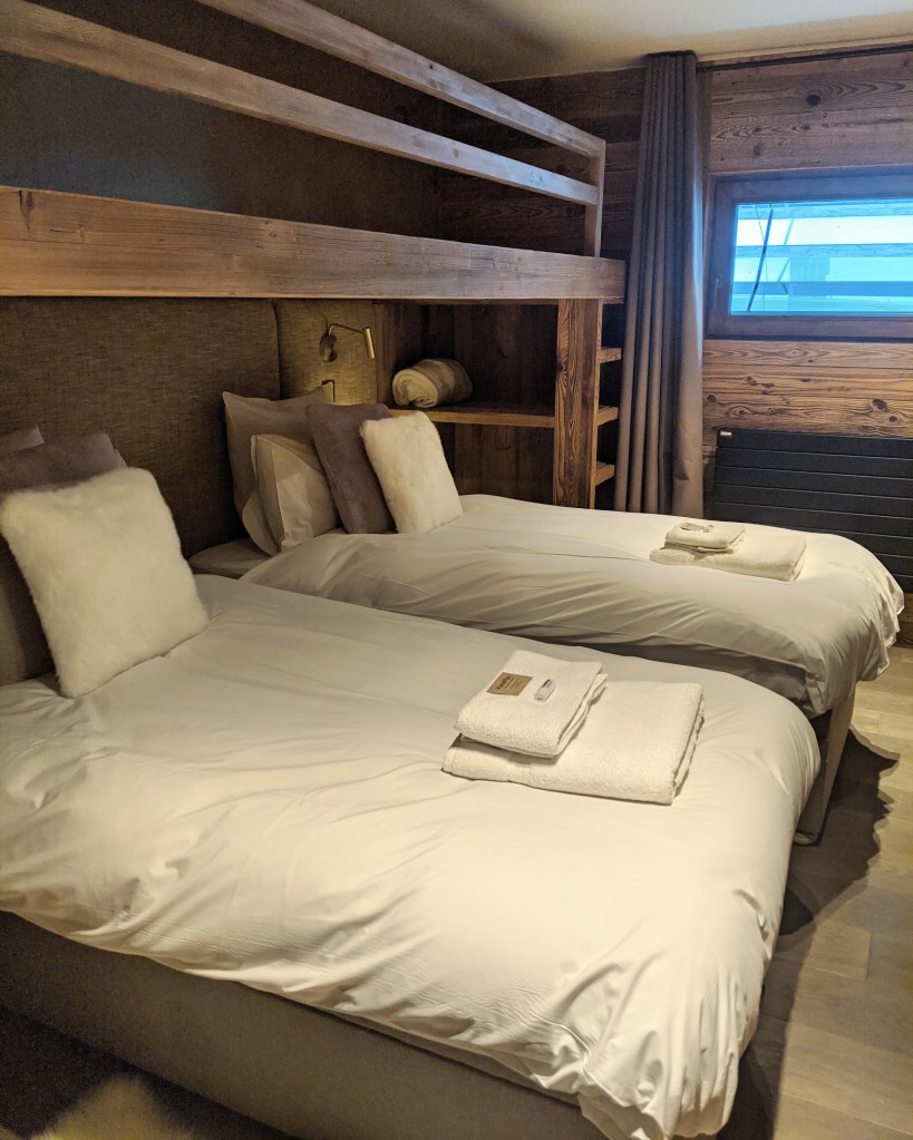 We stayed a week at Chalet Baita, a fully catered luxury chalet in Meribel Village (just outside of Meribel Centre) which looks up to the Roc de Fer. We paid £1,350 each (8 people) which isn’t the cheapest option but it meant we had a 4 bedroom modern, luxe chalet with 7 nights accommodation, 7 days of breakfast, 6 days afternoon tea and 6 nights of four-course dinners with free flowing wine and beer. The chalet had traditional wooden beams making it feel super homely, a fireplace, cosy living area and a private outdoor hot tub!