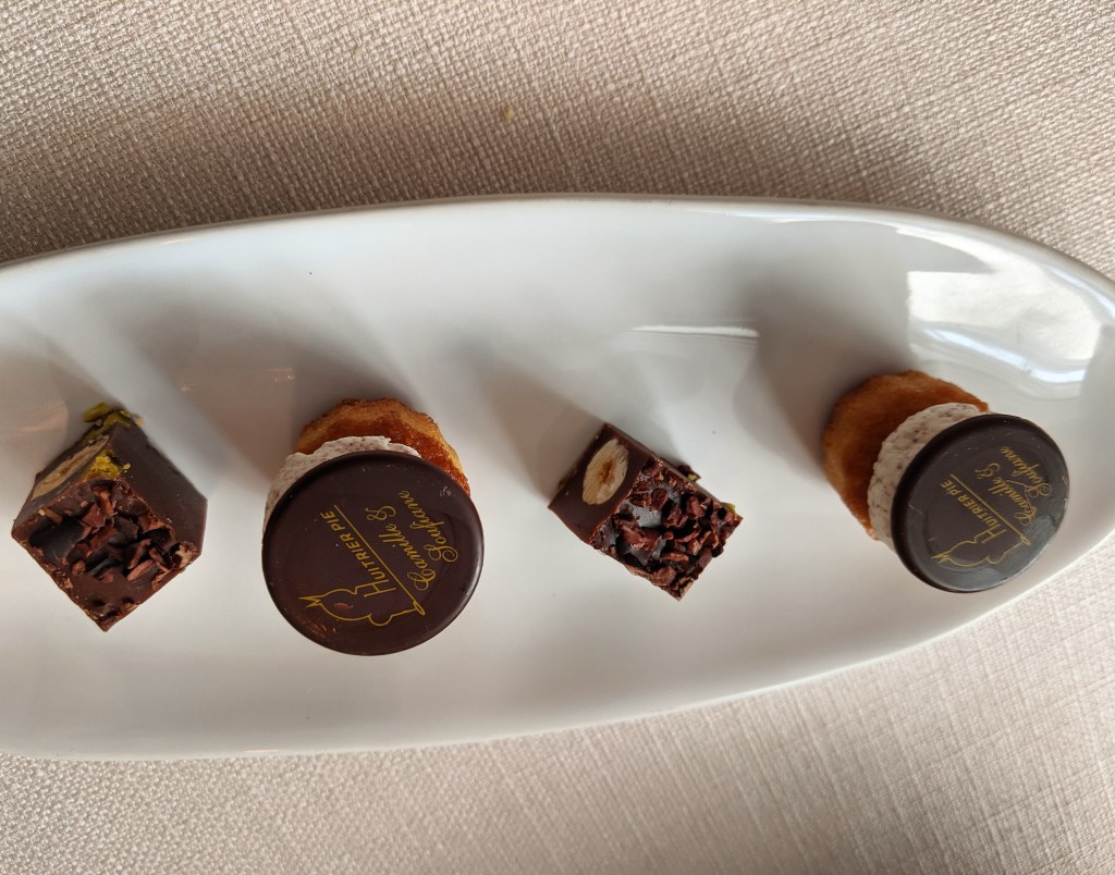 We went to L’Huitrier Pie for lunch. We had the 3 courses which started off with some canapes, then the white asapargus with scallops and haddock with a yuzu mousse as the starter, the chicken with foie gras in red wine with seasonal vegetables and after, a citrus, chocolate, crunchy meringue dessert. The meal ended with some petit fours. The 3 course lunch menu is good value at €34.