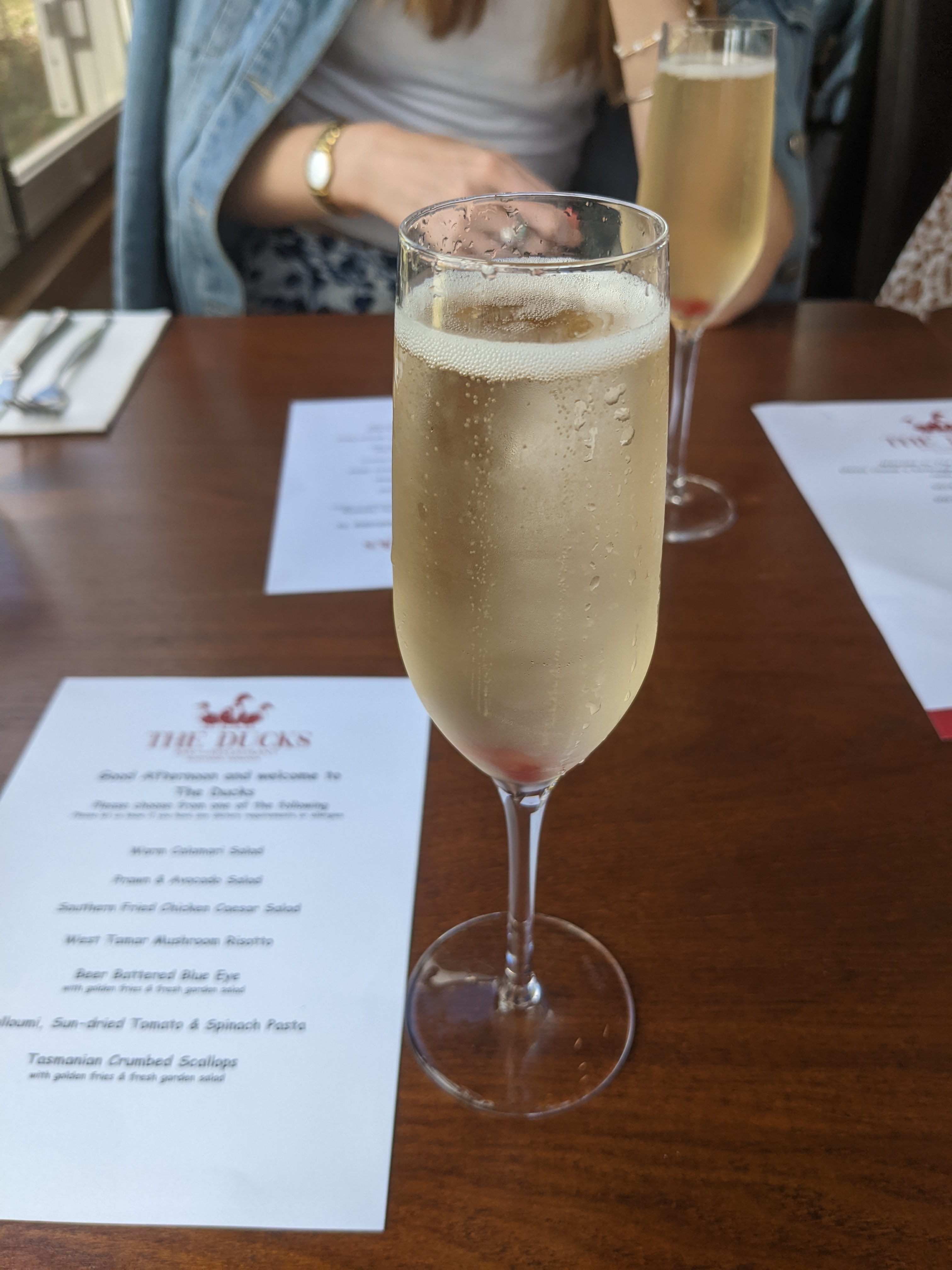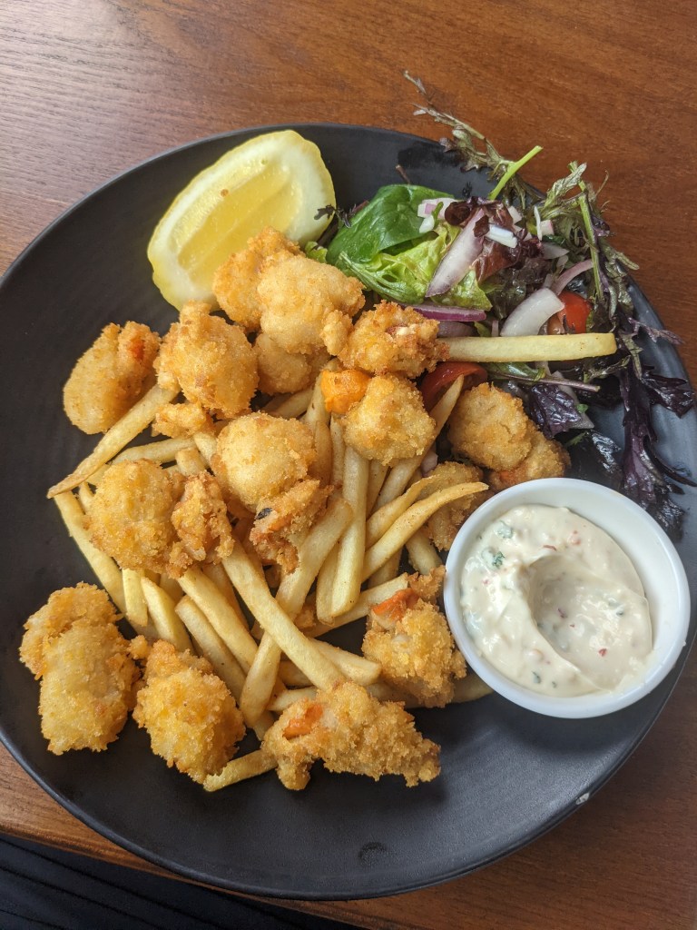 The next stop was The Ducks where we had lunch. I had a glass of sparkling and the crumbed scallops with chips and salad.