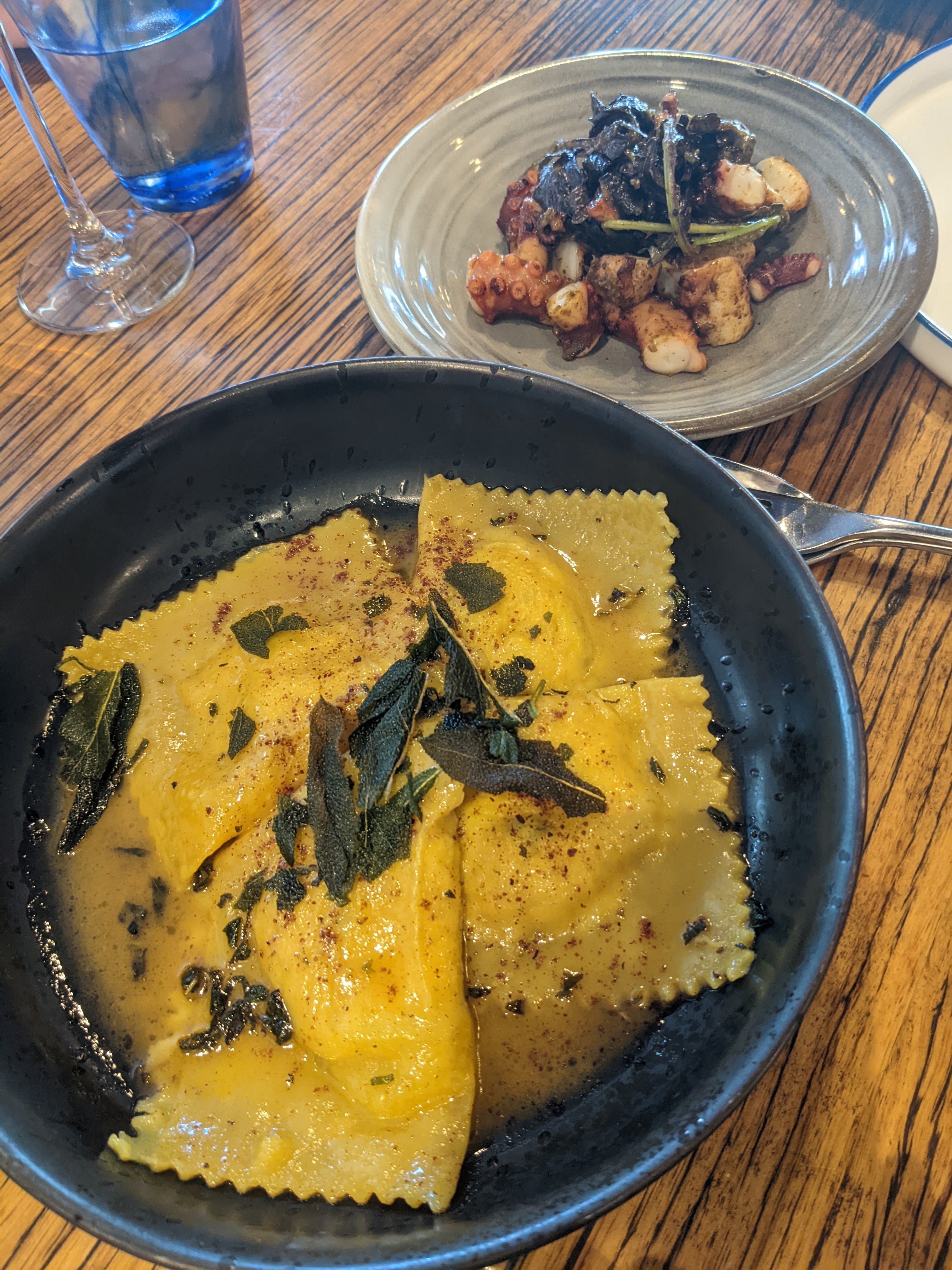 We had our last lunch at Geronimo which was great. We shared a bottle of sparkling rose and pinot gris and for food we shared the oysters, crab and corn ravioli, octopus, king fish crudo, lobster spaghetti and lamb shoulder which were all delicious.