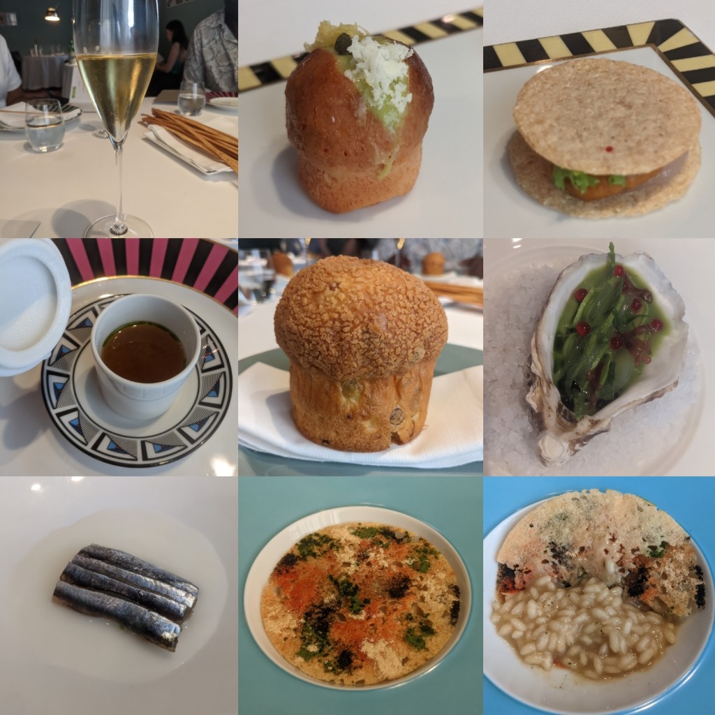 We had a lunch reservation at Osteria Francescana and did the 12 course tasting menu which costs €320. We had an aperitif of the ca’ del bossco to start and shared a bottle of white wine. The dishes were all creative and the tasting menu had a lot of good dishes but there were a few lacklustre ones and no meat dishes. My favourites were the mini pannettone, oyster, risotto, the “porchetta” turbot and “oops” dessert. The service was polite and polished and overall it was still an amazing experience but with the price you pay, you do expect all the dishes to be outstanding.