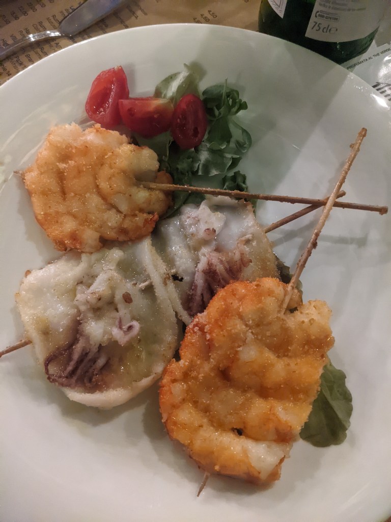 Given it’s August and summer holidays, a lot of the restaurants we wanted to go to were closed. We went to Osteria Bartolini and shared the oysters, fish croquettes, warm octopus salad, clams with spaghetti and grilled prawns and calamari. We enjoyed the meal but it wouldn’t be our first choice in Bologna.