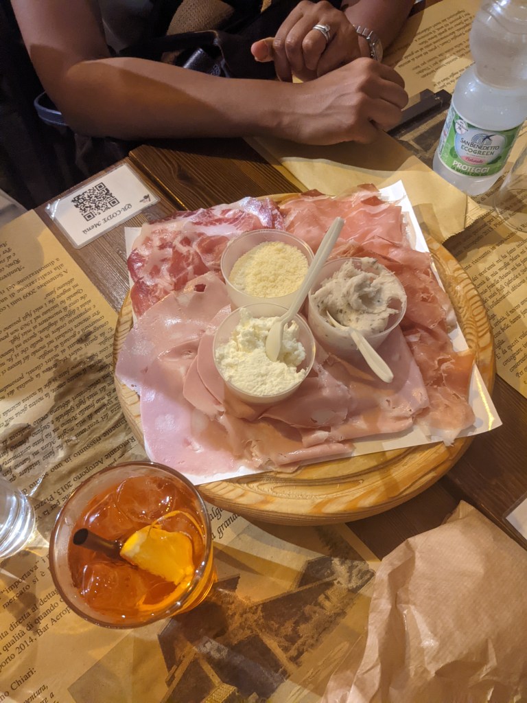 We arrived on Friday evening (after delays) and took the Marconi Express to Bologna Centrale (8 mins) and walked to our hotel. We went to Kinotto Bar which was a super local sports bar (but very convenient as it was opposite the hotel), so we had some aperol spritz before calling it a night.